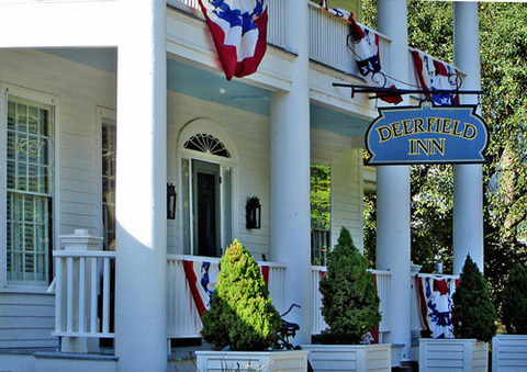 Old Deerfield Burial Ground: mound in back by building is mass grave from 1704.