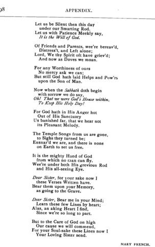 Not everyone was literate, but more than one might suppose. The Puritans required schools for towns with more than 40 families, and schools like Dame Beaman’s abounded. They taught boys and girls up to ten years of age in basic skills, reading (mostly the Bible) and some writing. At the age of ten, girls could continue to study at home or help with the elementary school as Lizzie and her friends did. Not all children attended but many did and some excelled. A wonderful example is the captive, Mary French, who returned to New England with her father while her sisters, Freedom and Martha, remained to become members of French-Canadian society. She is said to have written a poem to convince her siblings to abandon Catholic Canada and return to Puritan New England. It is a remarkable document for a young girl of 17. Read More